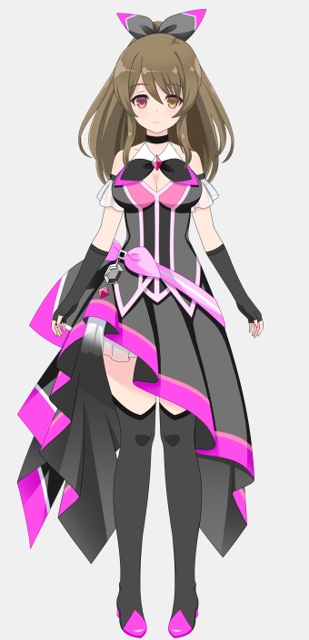 黒をベースにした衣装に、鮮やかなマゼンタピンクのアクセントが効果的に配置されていて、とてもスタイリッシュな印象を与えています。この色の組み合わせは大胆でありながら、統一感もあります。