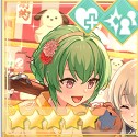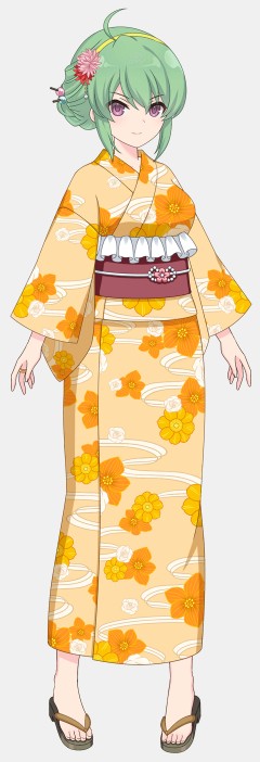 帯の深い紫色が衣装全体のアクセントになっていて、黄色系との色の組み合わせがとても調和しています。キャラクターの緑色の髪との対比も素敵で、全体的にバランスの取れた配色になっています。