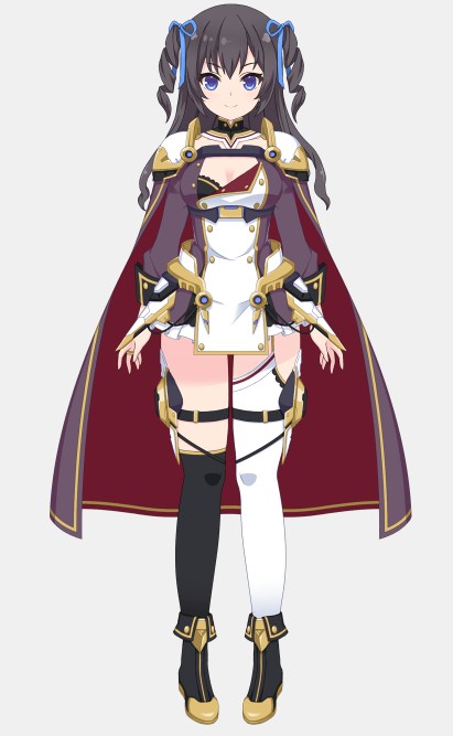 ツインテールにリボンを添えた可愛らしい髪型が、厳めしい鎧デザインを中和し、親しみやすさや少女らしさを強調しています。